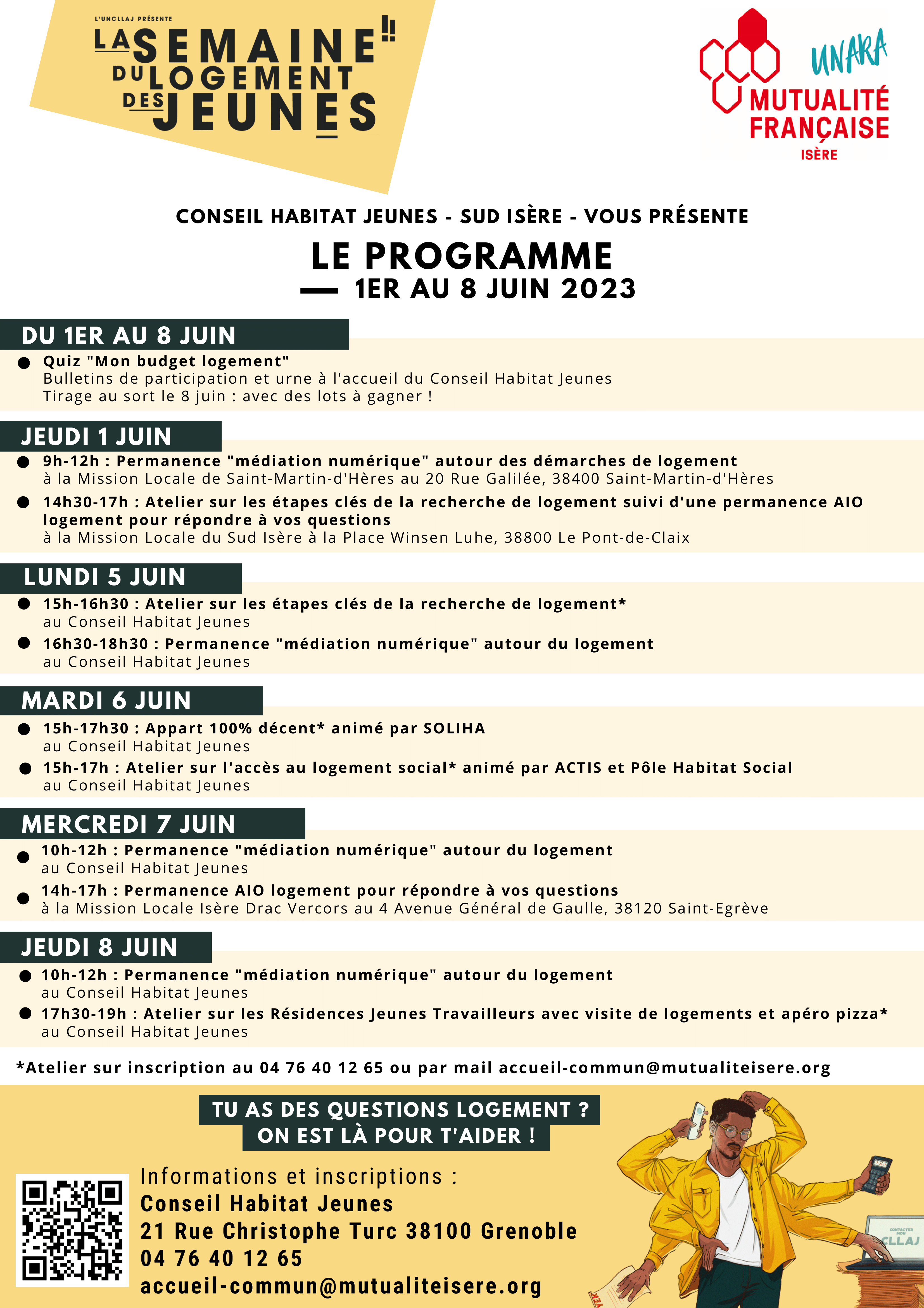 Du 1er juin et jusqu’au 8 juin prochain, le Conseil Habitat Jeunes (Sud Isère – Pôle Habitat Insertion Jeunes de la MFI) organise la 14ème édition de la Semaine du logement des jeunes. Un rendez-vous gratuit, ouvert à tous les jeunes âgés de 16 à 30 ans qui souhaitent s’informer sur les étapes clés de la recherche de logement.