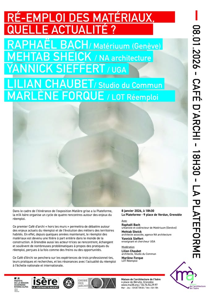La Maison de l’architecture de l’Isère, dans le cadre de l’exposition Matière grise présentée à la Plateforme, propose un Café d’archi afin de questionner les enjeux actuels du réemploi (désormais filière à part entière dans le monde de la construction) qui peut être vu comme un frein ou une opportunité et l’évolution des métiers des territoires habités. Des intervenants architectes et un enseignant-chercheur seront invités à faire part de leurs expériences et réflexions.