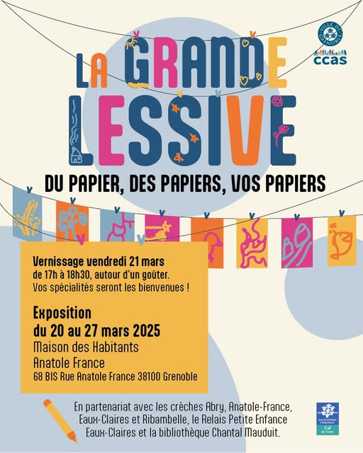 À l’occasion de l’événement international la Grande Lessive, lancé par la plasticienne Joëlle Gonthier, venez découvrir les œuvres réalisées par les enfants des crèches des secteurs 2 et 3 sur le thème « Du papier, des papiers, vos papiers ». Gratuit.