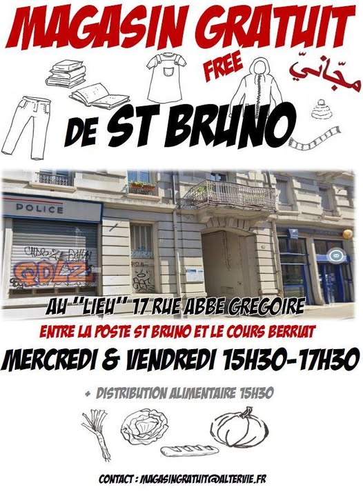 Il a déménagé au Lîeu, pendant les travaux du 38, squat d’activités du quartier Saint-Bruno. Une délocalisation de seulement 200 m ! Attention seulement deux jours par semaine, vous trouverez gratuitement des vêtements, de la literie, de l’électroménager, de la vaisselle, des meubles… A côté du magasin gratuit, un « libre service gratuit », accessible en permanence, permet d’avoir accès à des aliments issus de récups du marché et des magasins.