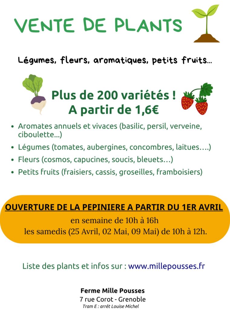 Comme chaque année, Mille Pousse organise sa grande vente de plants : plus de 200 variétés de fleurs, aromatiques, petits fruits, vivaces et légumes, à partir de 1,60 €.
