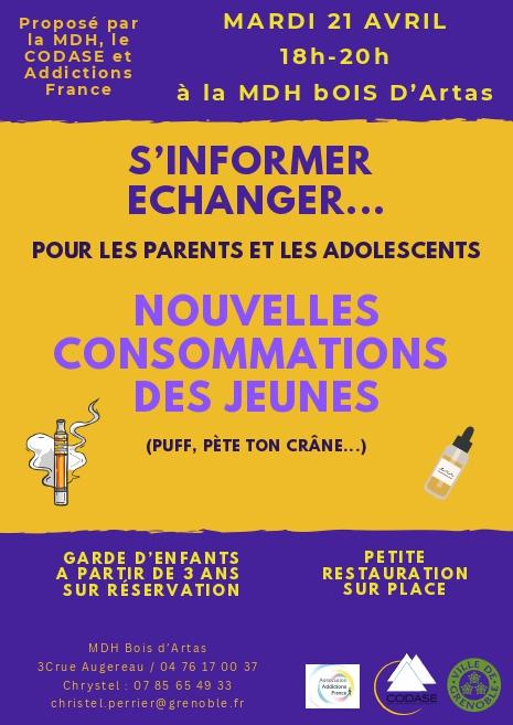 Conférence proposée par le CODASE et Addictions France, à destination des parents et des adolescents pour s’informer, échanger autour des nouvelles consommations des jeunes (puff, pête ton crâne, proto…).