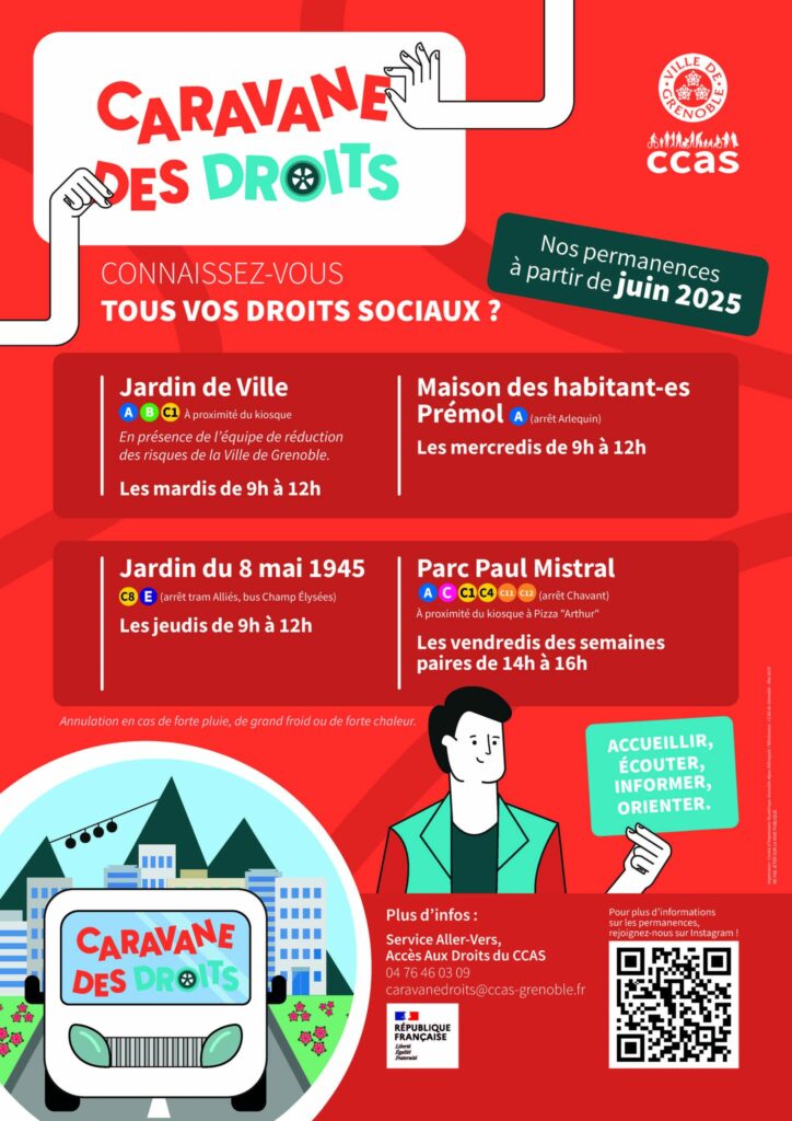 Informations d’accès sur le flyer de la Caravane des droits. Pour toute question ou besoin d’informations complémentaires, vous pouvez les contacter par téléphone au 04 76 46 03 09 ou par mail à caravanedroits@ccas-grenoble.fr.
