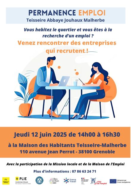 Vous habitez les quartiers Teisseire, Abbaye Jouhaux ou Malherbe ? Oui. Vous cherchez un emploi ? Oui. Vous êtes jeune, beau mais pauvre ? Oui. Alors venez rencontrer des entreprises qui recrutent à la Maison des habitants Teisseire-Malherbe, le jeudi 12 juin de 14h00 à 16h30.