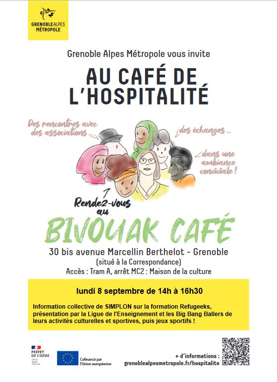 Venez échanger et rencontrer les associations de la Correspondance au Bivouak Café. Vous pourrez en apprendre davantage sur la formation Refugeeks présentée par SIMPLON mais aussi échanger avec la Ligue de l’Enseignement, les Big Bang Ballers, et un groupe de la Place des Femmes de l’AFPA.
