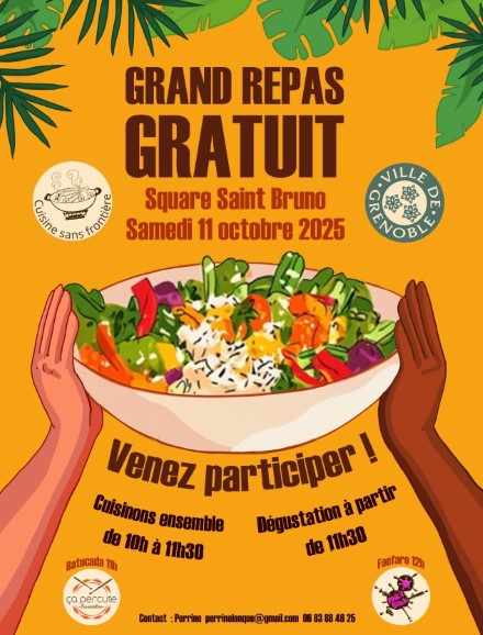 Cet événement convivial vous est proposé par Cuisine Sans Frontières et la Maison des Habitants Chorier-Berriat. Il est possible de participer à l’élaboration des plats dès 10h avec les associations présentes, ou de les déguster à partir de 11h30. L’ambiance sera festive, aux sons de la batucada « Ça percute » et de la fanfare « Pink it Black ».