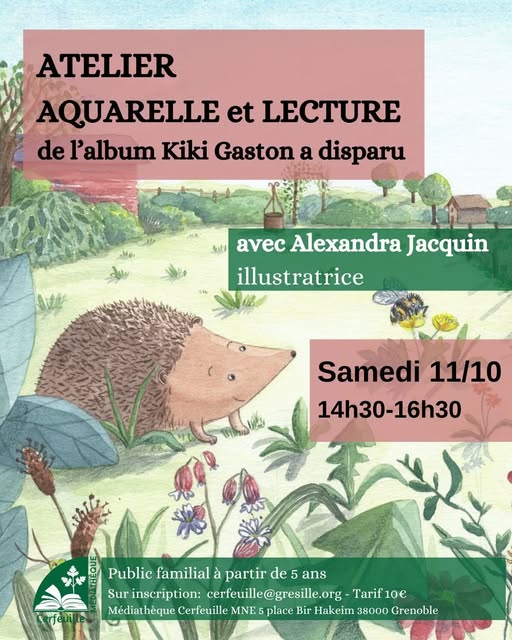 L’illustratrice Alexandra Jacquin organise, à la médiathèque Cerfeuille, une lecture de l’album jeunesse Kiki Gaston a disparu, suivi d’un atelier pour apprendre à dessiner à l’aquarelle les hérissons et la petite faune des jardins.