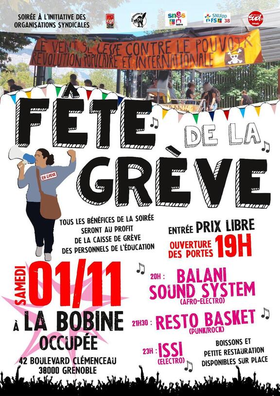 Parce que l’état de l’éducation en France fait plus peur qu’Halloween, l’Intersyndicale Education Isère organise une soirée concerts Fête (de la) grève pour alimenter la caisse de solidarité avec les personnels grévistes de l’éducation en Isère.