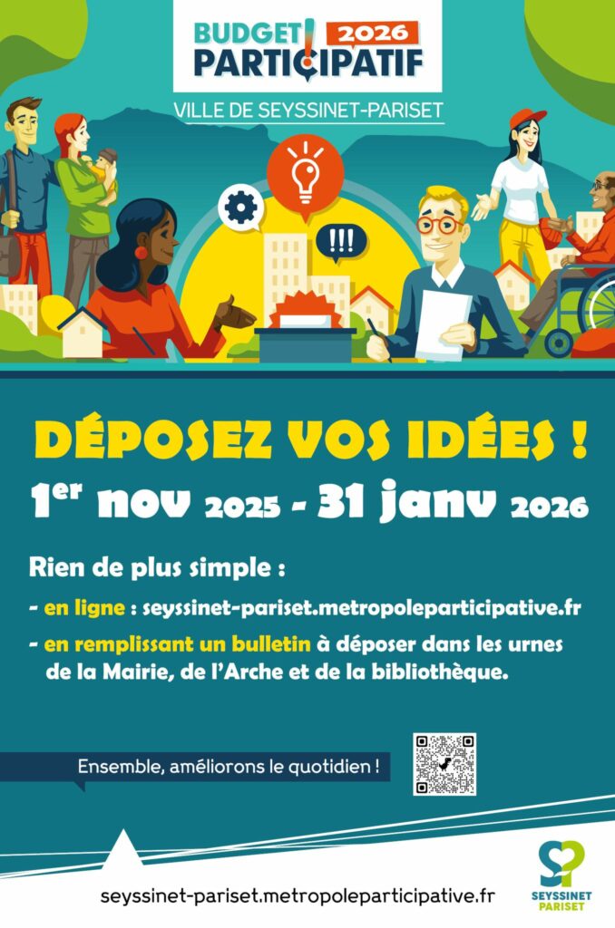 Habitants de Seyssinet-Pariset, vous pourrez dès le 1er novembre, et jusqu’au 31 janvier 2026, proposer et choisir les projets que vous souhaitez voir se réaliser pour la transformation de votre ville et l’amélioration de votre quotidien. Rendez-vous en ligne, ou dans les urnes de l’Hôtel de Ville, de l’Arche ou de la bibliothèque.