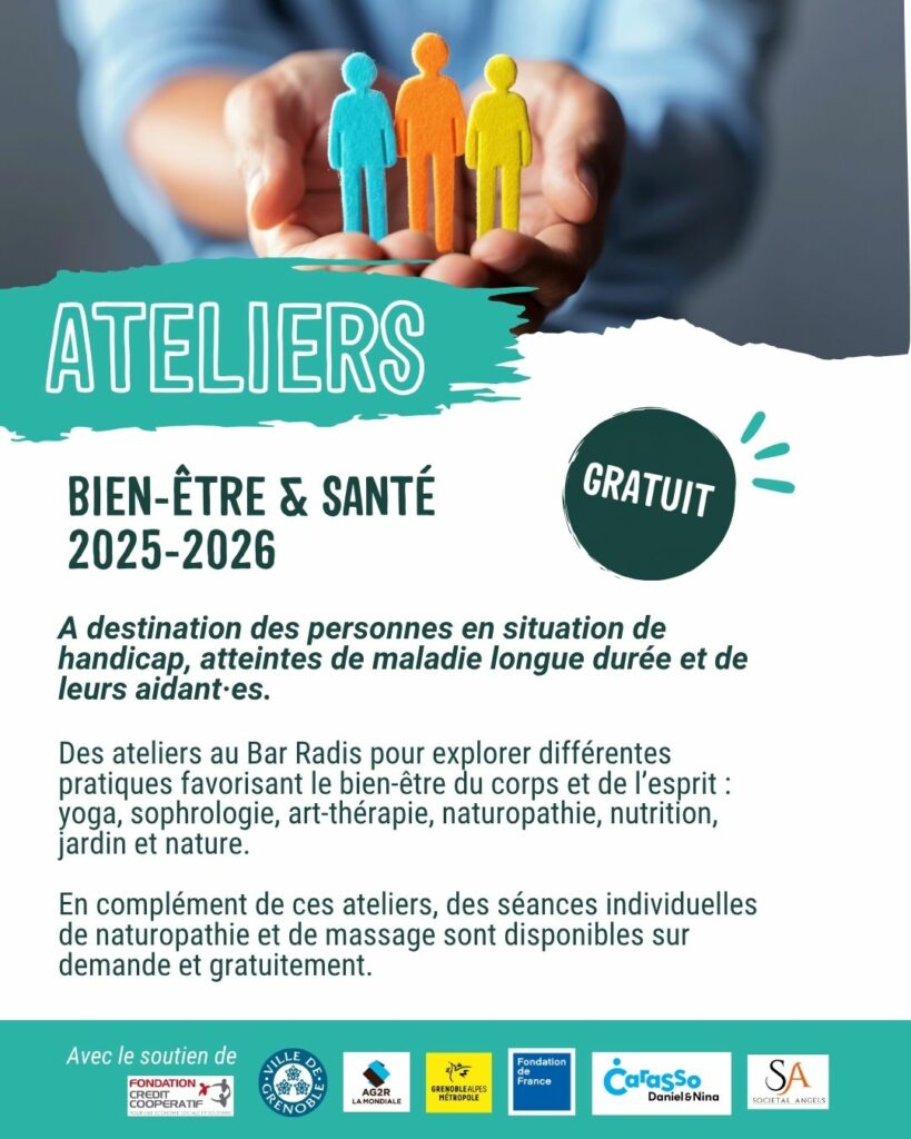 TLe Bar Radis organise des ateliers bien-être et santé à destination des personnes en situation de handicap ou atteintes de maladie longue durée et de leurs aidant(e)s un vendredi par mois. Ce premier rendez-vous sera l’occasion de découvrir les ateliers proposés dans le futur, faire connaissance avec les intervenants et leur poser vos questions. De petits jeux d’introduction sur la cuisine et le bien-être sont aussi prévus. Retrouvez le programme de novembre à juin sur la page facebook du Bar Radis