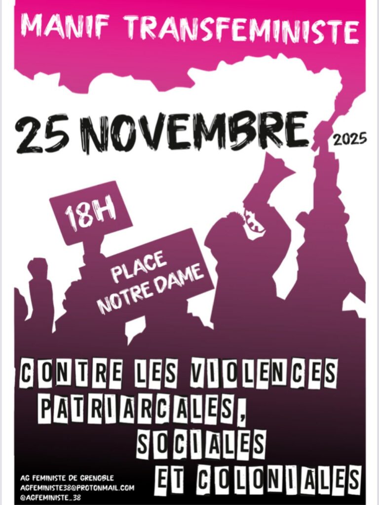 Appel à manifester de l’Assemblée Générale féministe de Grenoble contre les violences patriarcales, sociales et coloniales à l’occasion de la journée internationale de lutte contre les violences faites aux femmes.