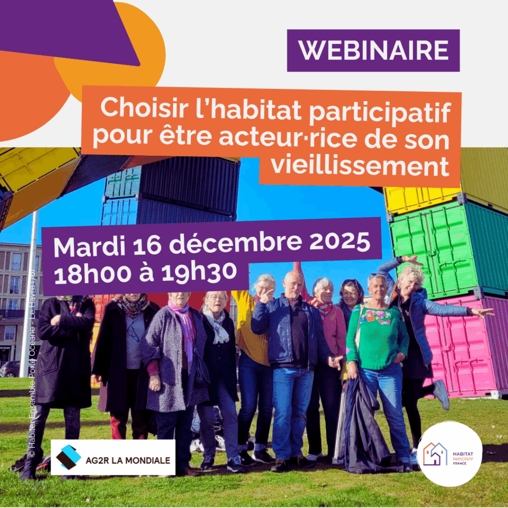 Dernier webinaire de 2025 du programme « Habitat Participatif et seniors » financé par AG2R LA MONDIALE, ce rendez-vous sera l’occasion de découvrir les récits et les étapes parcourues par six personnes ayant fait le choix de l’habitat participatif afin de devenir acteurs de leur vieillissement. Inscriptions en ligne, ouvertes à tous.