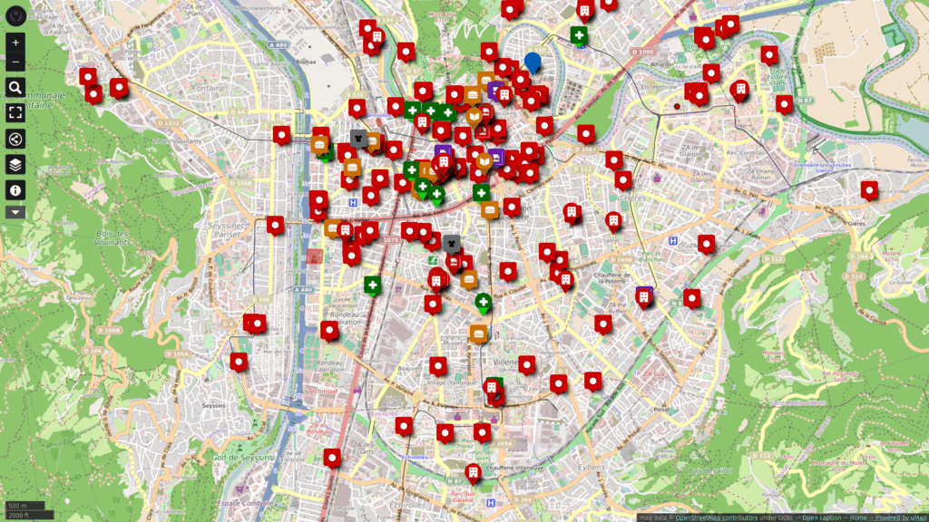 Welcome Grenoble Map est une carte interactive de l’agglomération grenobloise recensant les principaux lieux d’accueil destinés aux migrants, réfugiés, personnes sans abri ou en situation de grande précarité. On y retrouve, entre autres, les points de distribution de nourriture gratuite, les structures de soins, les espaces pour se laver ou se reposer, les associations d’aide juridique ou administrative et les centres d’hébergement.