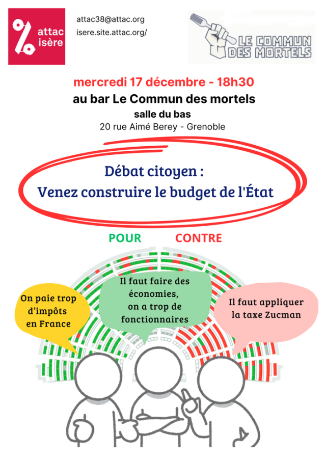 Soirée de discussion organisée par Attac 38 pour argumenter autour des mesures budgétaires, mieux comprendre comment le budget est organisé et réfléchir à des solutions alternatives qui se feraient avec les citoyens.