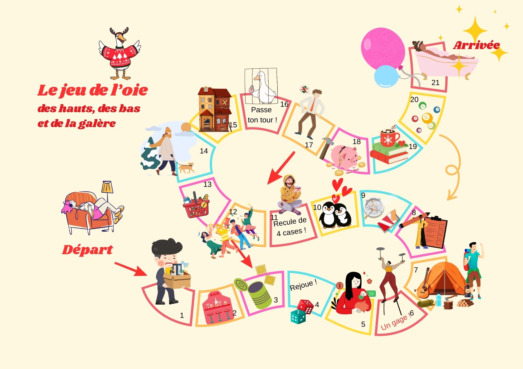 Et si la vie était un vaste jeu de l’oie ? Vous êtes invité à faire un pas de côté par rapport aux hauts et aux bas de la vraie vie et à en jouer avec vos enfants, neveux et nièces. Surtout, gardez en tête que les situations difficiles finissent par passer, cultivez toujours une lueur d’espoir et des rêves qui donnent de l’élan !