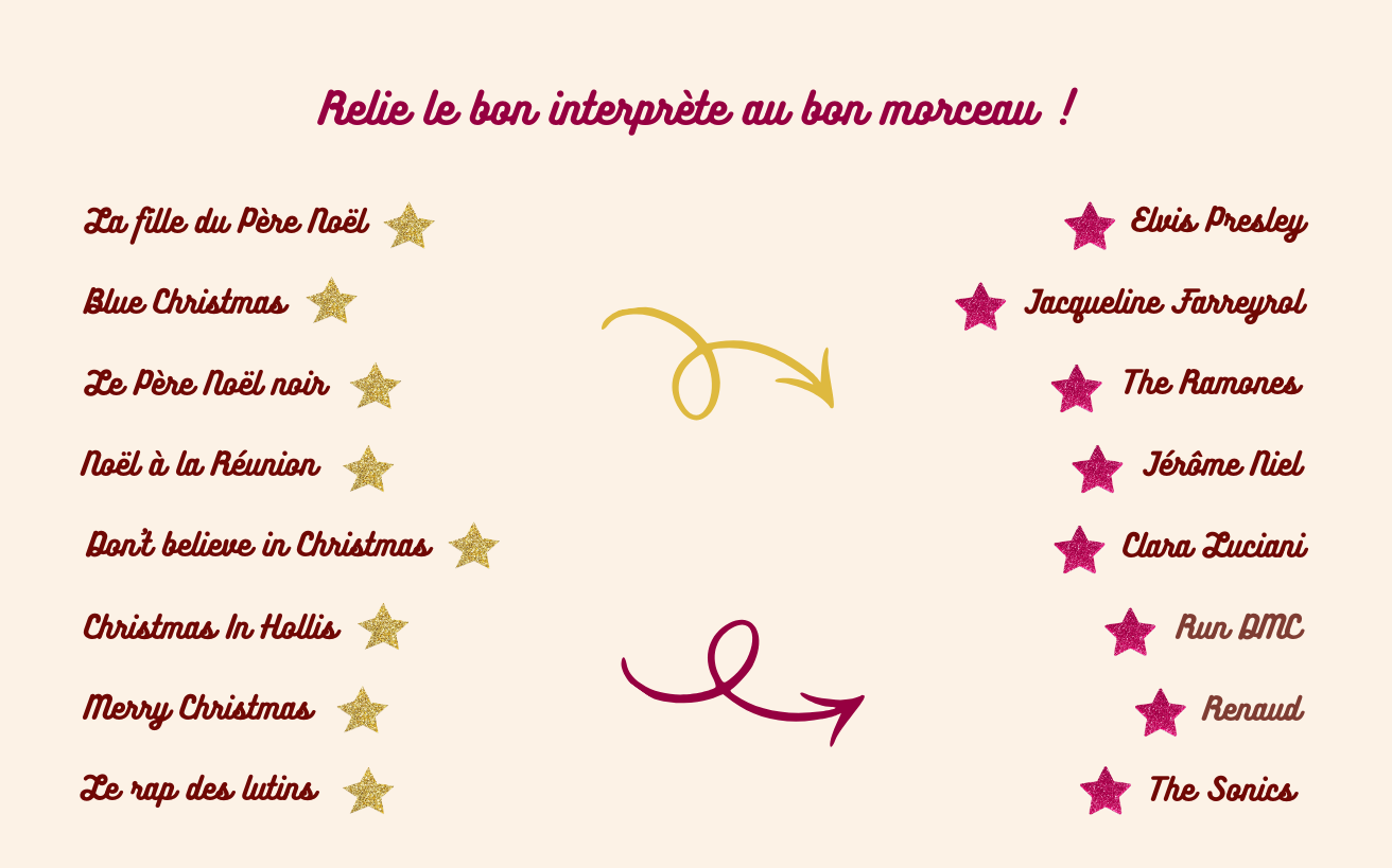 All I want for Christmas is… pas nécessairement Mariah et ses envolées lyriques ou l’énième reprise de Douce Nuit par le « Chœur des petits chanteurs de la Croix de Bois, Croix de Fer ». On vous a donc élaboré une petite playlist alternative qui sort des pistes balisées, afin que paroles et harmonies coulent tel du miel ou une fondue au chocolat dans vos petites oreilles rougies par le froid. Par contre, c’est bientôt Noël, c’est la course, et nous aussi on a des mugs moches mais rigolos à acheter pour Tonton Alphonse, du coup on vous laisse relier vous-mêmes chansons et interprètes.