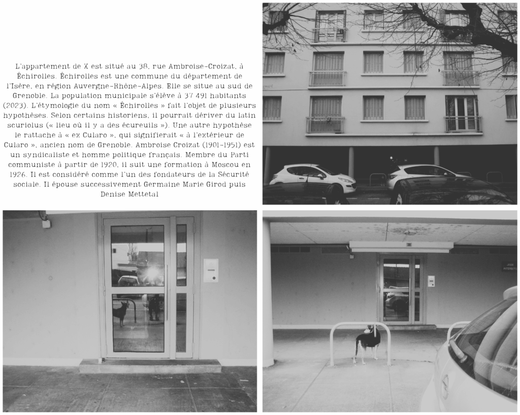Lorsque commence son suivi avec Totem, Maria demeure alors depuis plusieurs mois dans l’appartement du 38, rue Ambroise Croizat, à Échirolles. Le logement est composé de deux pièces : une pièce principale faisant office de chambre à coucher et une pièce secondaire qui sert de décharge. L’homme qui y habite bénéficie d’un aménagement de peine ; il exécute une partie de sa condamnation hors des murs de la prison, en placement à l’extérieur. Son hébergement et son accompagnement socio-judiciaire sont pris en charge par l’association Ajhiralp. L’appartement de la rue Ambroise Croizat est le quatrième logement qu’il occupe. Ses appartements sont tous irréversiblement dégradés, les portes d’entrée sont fracturées et les vitres sont cassées. L’hébergement, même temporaire, de personnes extérieures au dispositif étant formellement interdit, je me cache dans des trous de souris. En deux mille douze, l’homme a été condamné à douze mois de prison ferme pour violences conjugales.
